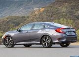 The windshield is flush-mounted to the cowl, improving aerodynamics and quieting the interior. Panel gaps are minimized and the B-pillars are black-finished, with stainless trim surrounding the side windows to visually emphasize the sweeping cabin shape. The side glass is flush with the pillars to reduce wind noise in the cabin, while also improving the quality feel of the new Sedan. Behind the sweeping roofline and C-pillars, the flush-mounted rear window is sleek and shallow, aiding to the new model's aerodynamic efficiency. While in back, LED "light pipe" taillights continue the wing design motif of the headlights in an unmistakable new Civic persona. A rear lip spoiler adds a sporty flair to the EX-T and above trims.