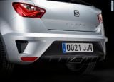 The side view of the three-door coupé is brought to life by the sharply executed lines and edges. The accentuated rear shoulders and the exclusive 17-inch wheels underscore its performance. The high-gloss black exterior mirrors set a clear contrast to the Ibiza CUPRA's paintwork. The powerful rear end once again underscores the special role played by the Ibiza CUPRA as a benchmark among compact sports cars, with the broad bumper framing the substantial, matt-black diffuser, which incorporates the trapezoidal tailpipe.